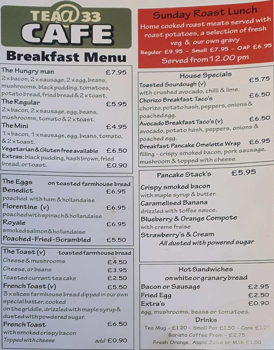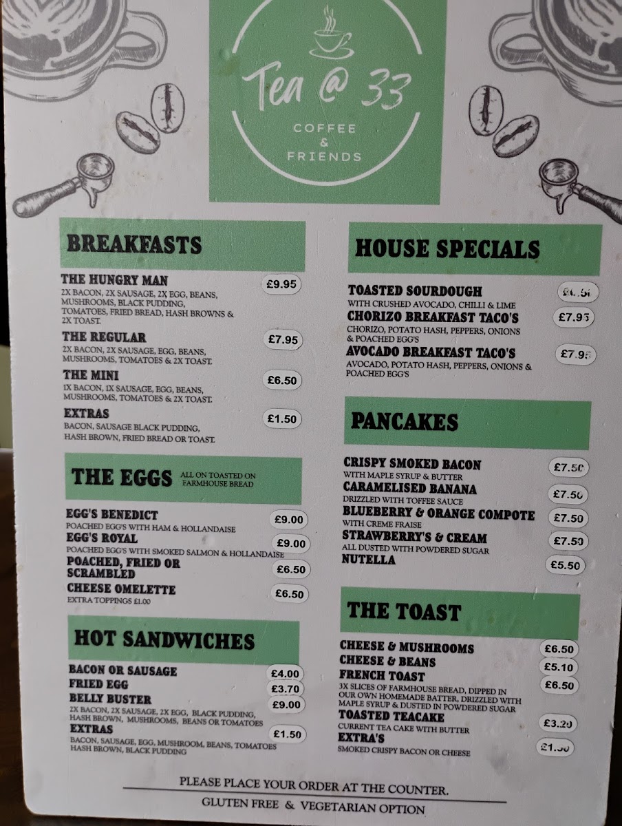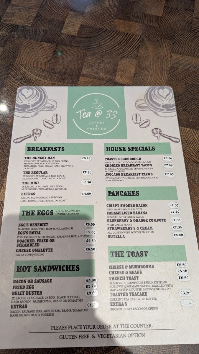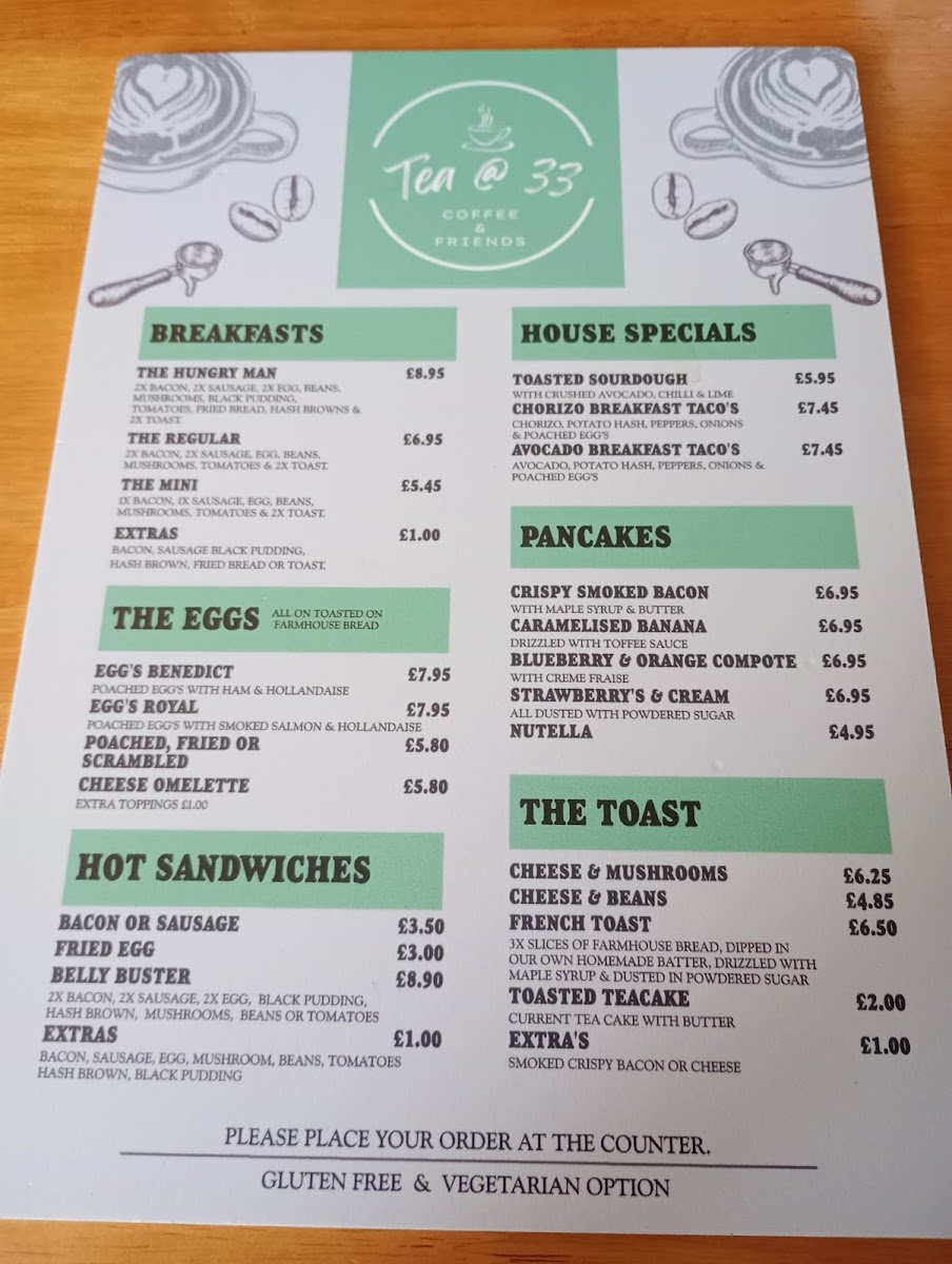 Overall, the menu at Tea @ 33 offers a well-rounded and comforting selection that caters to a variety of tastes, from hearty breakfasts to indulgent desserts. Starters like Tomato And Basil Soup set a simple yet satisfying tone, while desserts such as Apple Crumble, Christmas Pudding, and Chocolate Brownie provide classic sweet finishes. The breakfast range stands out with options like The Hungry Man, The Regular, and The Mini, complemented by creative house specials including Toasted Sourdough, Chorizo Breakfast Taco's, and Avocado Breakfast Taco's. Pancake lovers can enjoy choices like Crispy Smoked Bacon, Caramelised Banana, Blueberry & Orange Compote, Strawberry's & Cream, and Nutella, while egg dishes such as Egg's Benedict and Egg's Royal add a traditional touch. The menu continues to impress with comforting items like Cheese & Mushrooms, French Toast, and hot sandwiches including Bacon Or Sausage and Belly Buster. For something more filling, burgers like 33 Smoker, Spicy Bean Burger, and Jumbo Hotdog, along with mains such as Classic Baguettes, L.a. Chicken Sandwich, and The 33 Club Sandwich, provide plenty of variety. Additions like Beef Lasagne, Meatballs, and Vegetable Lasagne further enhance the selection, while drinks such as Espresso Martini and Pornstar Martini round off the experience. Altogether, the menu feels diverse, approachable, and satisfying, making it a great spot for both casual dining and indulgent treats.