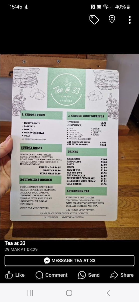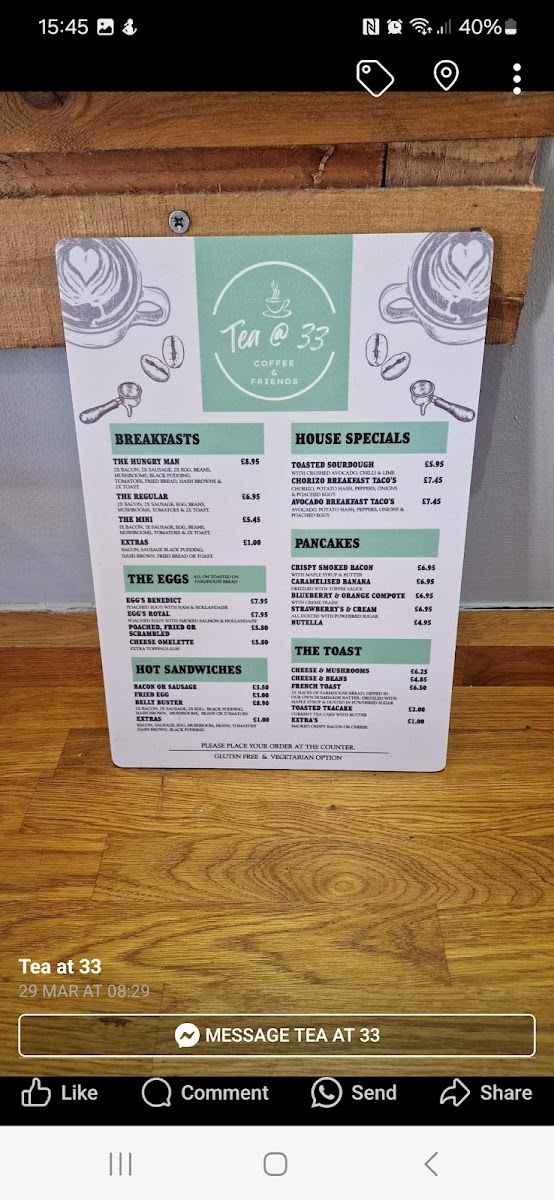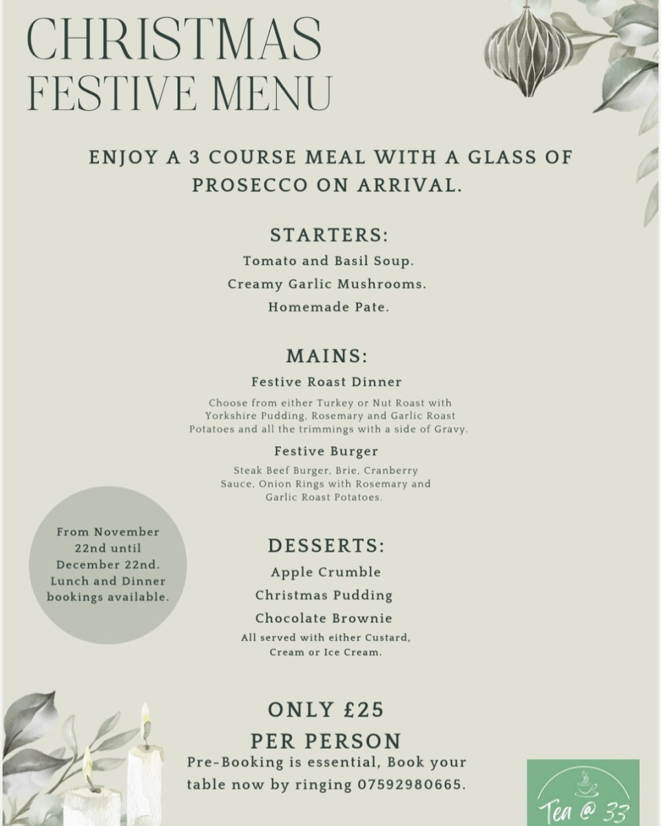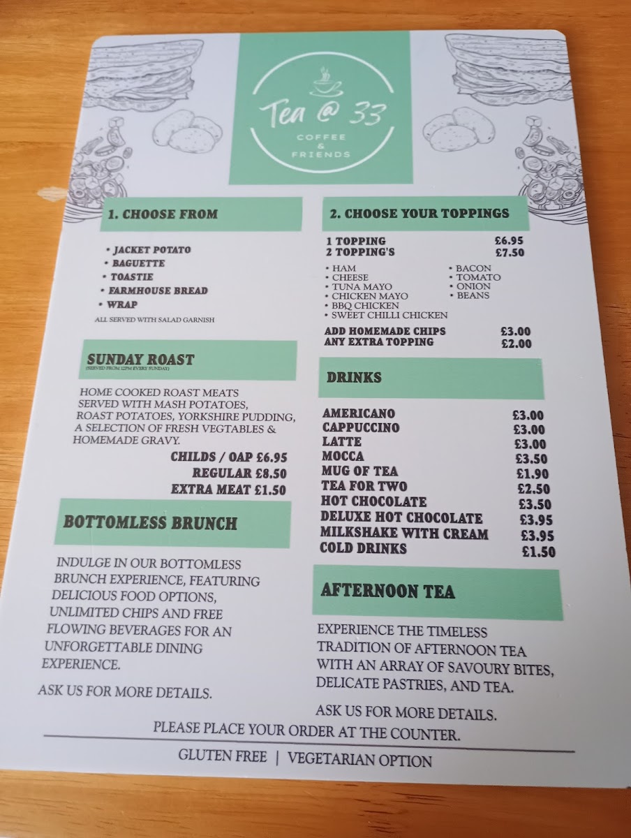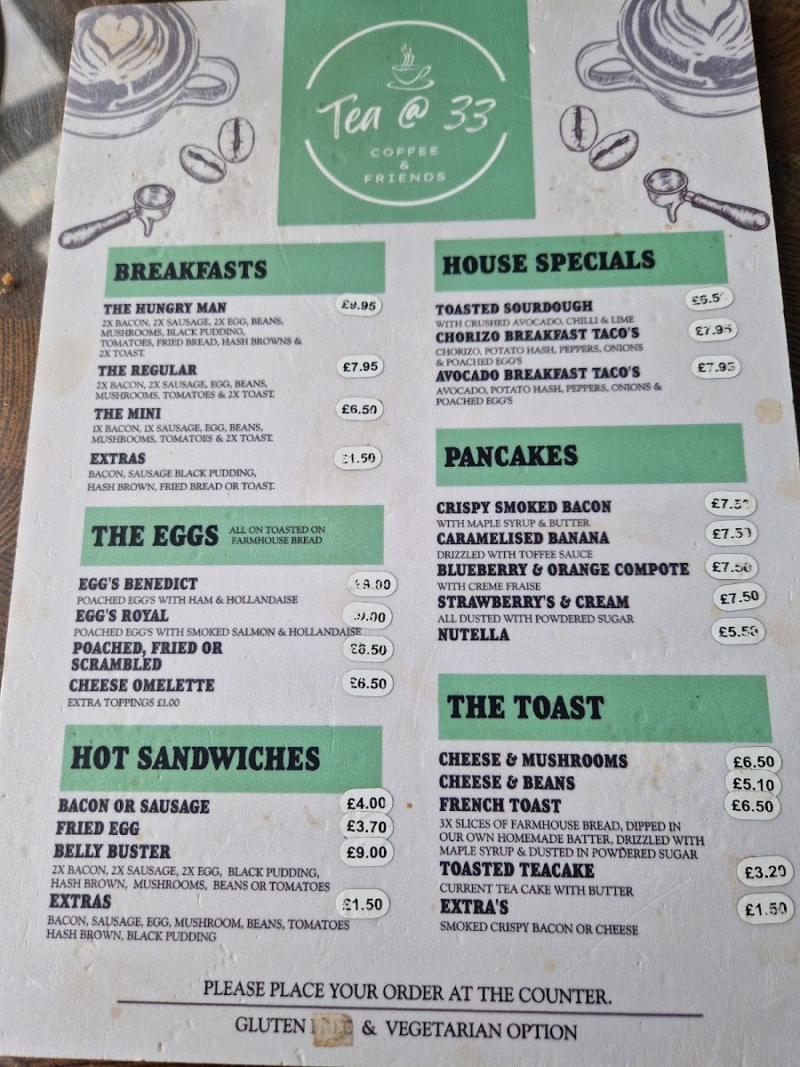 Overall, the menu at Tea @ 33 offers a well-rounded and comforting selection that caters to a variety of tastes, from hearty breakfasts to indulgent desserts. Starters like Tomato And Basil Soup set a simple yet satisfying tone, while desserts such as Apple Crumble, Christmas Pudding, and Chocolate Brownie provide classic sweet finishes. The breakfast range stands out with options like The Hungry Man, The Regular, and The Mini, complemented by creative house specials including Toasted Sourdough, Chorizo Breakfast Taco's, and Avocado Breakfast Taco's. Pancake lovers can enjoy choices like Crispy Smoked Bacon, Caramelised Banana, Blueberry & Orange Compote, Strawberry's & Cream, and Nutella, while egg dishes such as Egg's Benedict and Egg's Royal add a traditional touch. The menu continues to impress with comforting items like Cheese & Mushrooms, French Toast, and hot sandwiches including Bacon Or Sausage and Belly Buster. For something more filling, burgers like 33 Smoker, Spicy Bean Burger, and Jumbo Hotdog, along with mains such as Classic Baguettes, L.a. Chicken Sandwich, and The 33 Club Sandwich, provide plenty of variety. Additions like Beef Lasagne, Meatballs, and Vegetable Lasagne further enhance the selection, while drinks such as Espresso Martini and Pornstar Martini round off the experience. Altogether, the menu feels diverse, approachable, and satisfying, making it a great spot for both casual dining and indulgent treats.